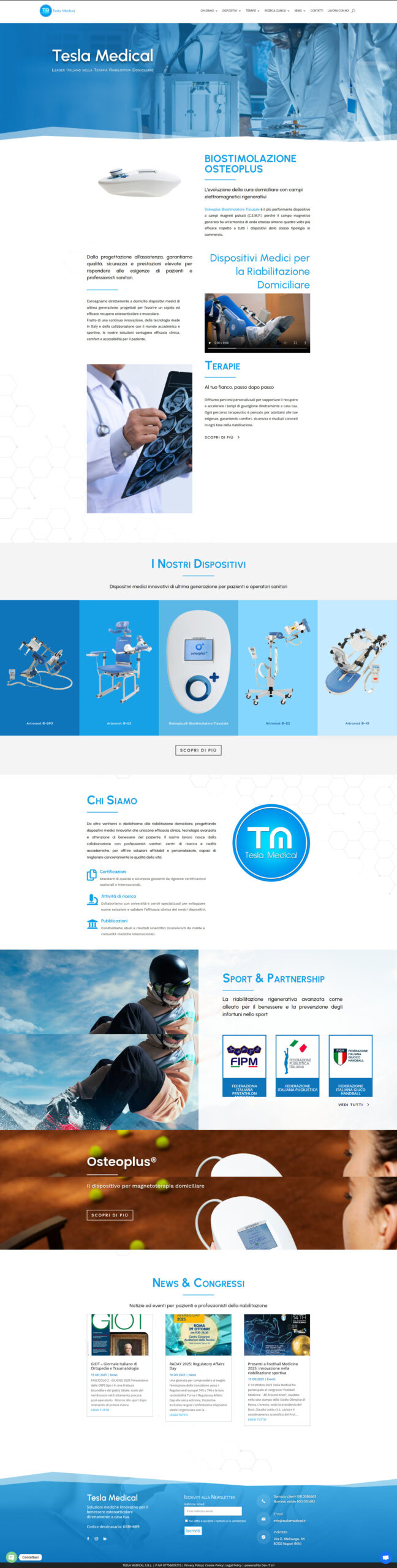 Tesla Medical è leader italiano nella terapia riabilitativa domiciliare e si contraddistingue per la produzione e noleggio di dispositivi medici certificati, progettati per garantire sicurezza, comfort e prestazioni elevate a pazienti e professionisti sanitari. Il sito web, completamente realizzato dalla dev-it srl, mette in risalto la capacità dell’azienda di coniugare innovazione, design accattivante e usabilità, con sezioni dedicate ai prodotti, alle certificazioni, alle attività di ricerca e alle partnership sportive con federazioni nazionali.
